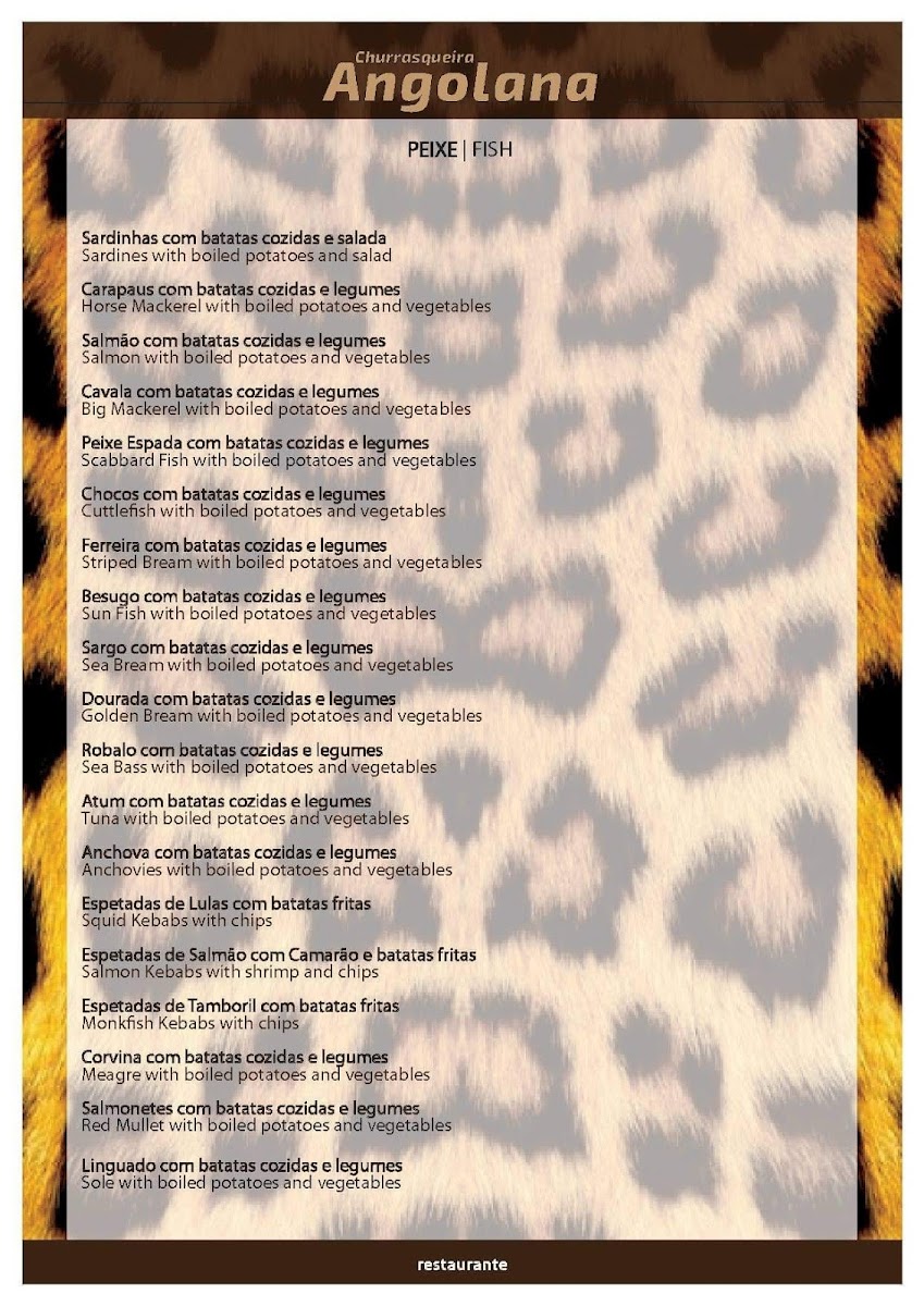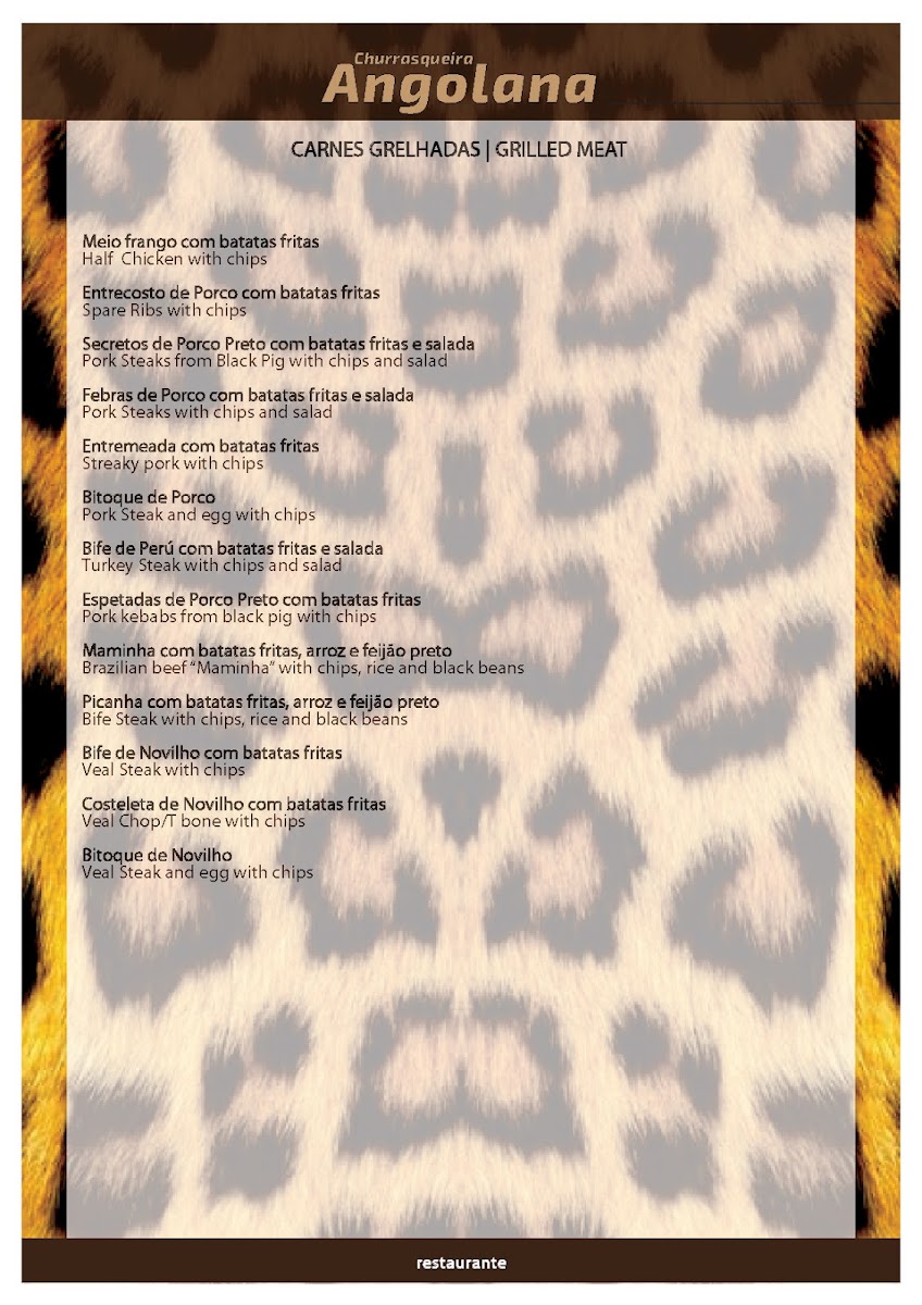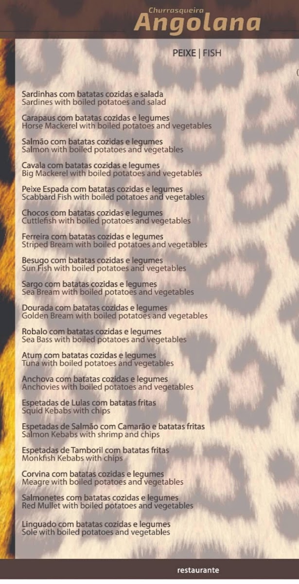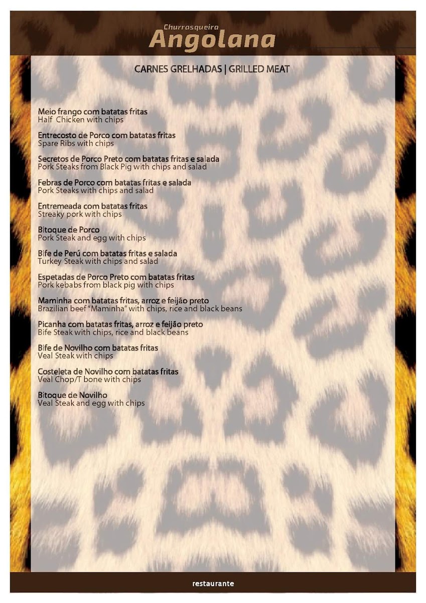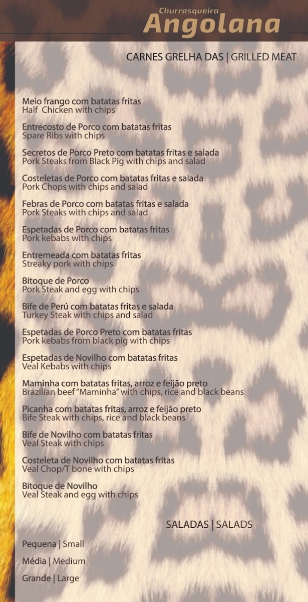 The menu at Churrasqueira Angolana offers a comforting blend of traditional Portuguese flavors with subtle African influences, centered around coal-grilled dishes. It brings a casual yet thoughtful dining experience, where both meat and fresh fish take the spotlight in simple, well-prepared plates.